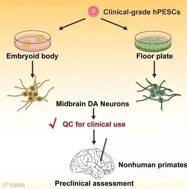 中科院周琪院士团队开展“人胚胎干细胞来源的神经前体细胞治疗帕金森病”临床试验,在该临床试验方案中,从胚胎干细胞诱导分化出来的神经前体细胞被注入到大脑中的纹状体部位,以期达到多巴胺神经元再生的效果。
