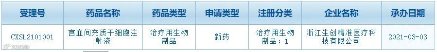 根据国家药监局药品审评中心(CDE)官网显示,浙江生创精准医疗科技有限公司(以下简称“浙江生创”)申报的“宫血间充质干细胞注射液”临床试验申请获得默示许可,适应症为特发性肺纤维化。值得一提的是,这也是国内首款获批临床的宫血来源干细胞治疗候选产品。