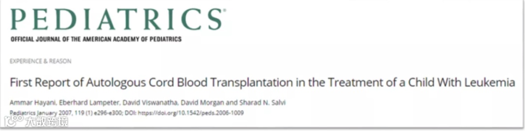 2007年,Ammar Hayani 等人在 Pediatrics 期刊发表文章,报道了世界上第一例使用自体脐血治疗白血病的案例。