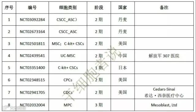 据调研统计,目前全球在研的干细胞治疗心力衰竭项目使用了脂肪干细胞(CSCC-ASS)、间充质干细胞(MSC)、C-kit 阳性心肌干细胞(C-kit CSCs)、脐带间充质干细胞(UCMSC)、心脏祖细胞(CPCs)、心球干细胞(CDCs)、间充质前体细胞(MPC)等干/祖细胞。Clinicaltrials.gov网站目前在招募的临床项目有8项,其中有些处在1期,有些处在2期。