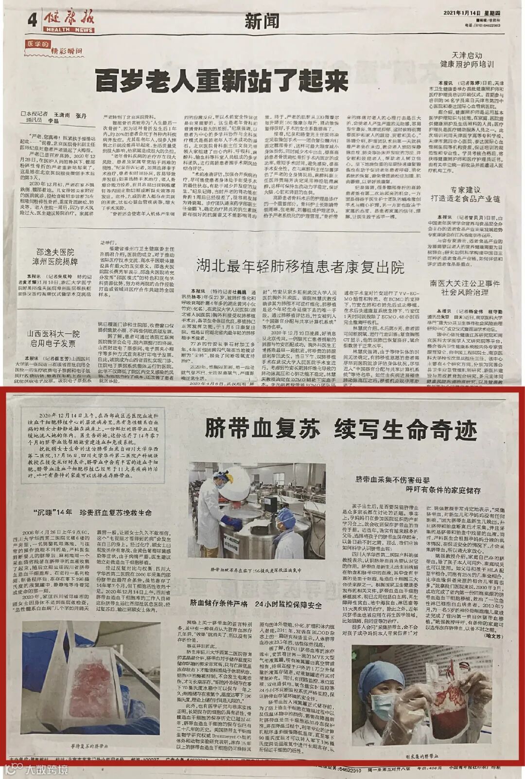 健康报2021年1月14日报道,《“沉睡”14年的脐带血复苏,续写生命奇迹》。