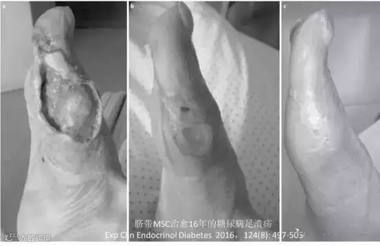 2016年的一个随机对照临床研究,评价间充质干细胞联合血管形成术治疗糖尿病足的效果,其中人脐带间充质干细胞治疗组28人(34个糖尿病足)和对照组25人(38个糖尿病足),MSC使用量为(4.8-8.6) x 107/人,所有的病人均接受血管形成术(angioplasty),治疗3个月后,所有病人均有不同程度的改善,包括溃疡面积、局部皮肤温度、踝肱指数(ankle brachial index,ABI)等指标,但是MSC治疗组的改善更加明显;其中治疗组中Fontaine 4级溃疡患者19人,有15人溃疡面痊愈,2人明显缩小、1人没效;MSC在糖尿病足溃疡周边注射有助于提高血管形成术的治疗效果(效果见图)。