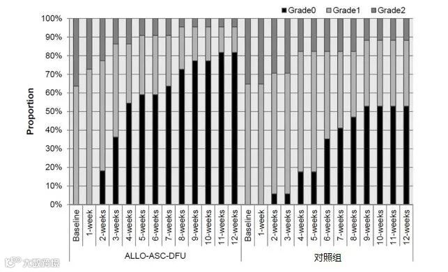 每周随访得到患者Wagner评分,比较Allo-ASC-DFU组与对照组的0-2级患者占比。可以看出,Allo-ASC-DFU组在1-12周的随访过程中恢复更快。