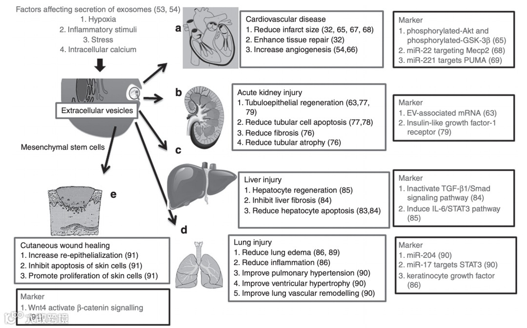 外泌体临床应用前景。例如:骨髓间充质干细胞衍生的外泌体在以下方面的治疗益处和作用机制:(a)各种心脏疾病,(b)肾损伤,(c)肝损伤,(d)肺损伤,(e)伤口愈合。