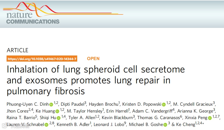 【据《Nature Communications》2020年2月报道】题:吸入肺球状细胞的分泌体及外泌体有助于肺纤维化的修复(作者Phuong-Uyen C. Dinh等)