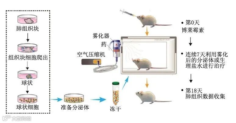 在这项研究中,团队建立了两种肺纤维化的动物模型,分别以博莱霉素和二氧化硅来诱导肺纤维化(如图)。研究表明通过吸入肺球状细胞的分泌体(LSC-Sec)或外泌体(LSC-Exo)可重建正常肺泡结构,促进肌成纤维细胞增殖,从而缓解博莱霉素和二氧化硅引起的肺纤维化。经过LSC-Sec或LSC-Exo处理的动物,肺功能可得到部分恢复,吸气量和呼吸顺应性均有明显改善。与间充质干细胞的分泌体及外泌体相比,LSC-Sec和LSC-Exo对动物肺纤维化的改善更为显著。