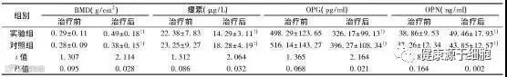 此项研究表明, 干细胞注射能够升高患者血清OPG水平, 从而抑制破骨细胞的产生, 达到治疗的目的。