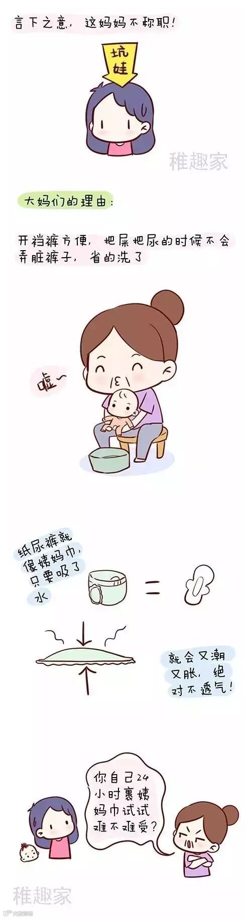 宝宝现在七个月,从小就没穿过开裆裤,现在温度将近30度,我也不会给她用尿布,因为尿湿后不及时更换反而会红屁股,而尿不湿不一样,尿不湿会充分吸收宝宝的尿液,使表面干爽!还有尿不湿和卫生巾真的一样嘛?卫生巾的外面有一层不透气的PE膜,尿不湿有吗?请拿出来对比一下!一周岁以内的孩子不建议把屎把尿,宝宝的脊椎还没长好,你是想让她以后腰折嘛?