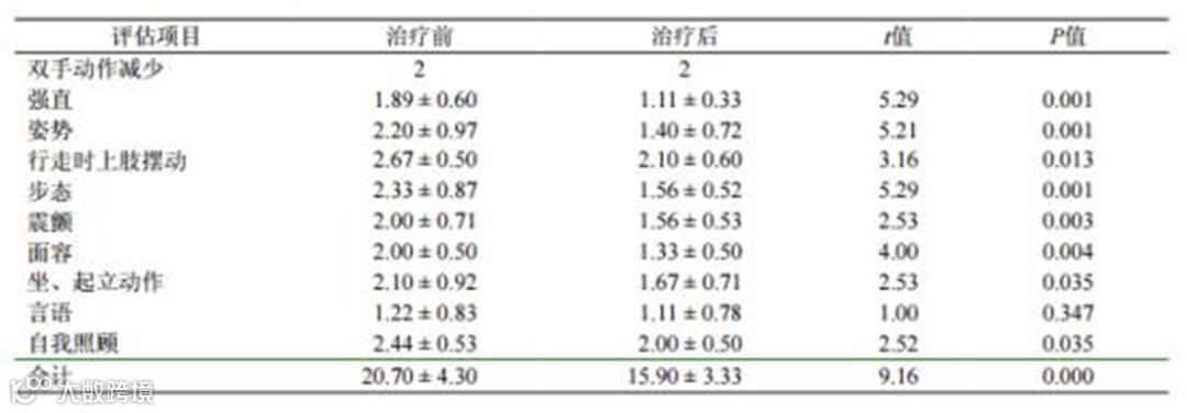行腰穿鞘内注射了间充质干细胞 0.5×107个,治疗后多数患者的部分症状得到改善,尤其以肌张力增高引起的异常症状改善明显,敏感的患者治疗后即有肌肉僵硬减轻,从Webster评分也可以看出,其中强直、姿势、步态、震颤、面容改善较明显(P均<0.01)。