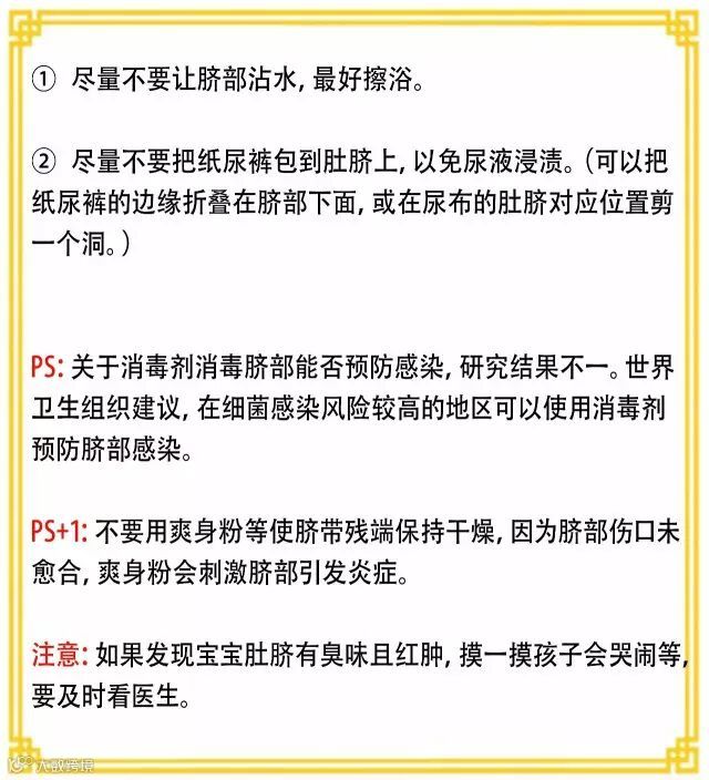 所以,为了预防感染,脐带残端脱落前,要保持脐部清洁和干燥(保持脐部干燥能让脐带残端萎缩、脱落得更快)。