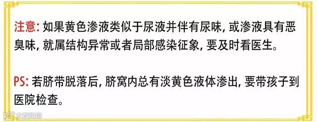不论是清亮的液体还是淡黄色稠厚液体,都是愈合中的脐带残端可渗出的液体,属正常现象。