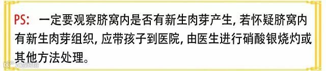 在肚脐愈合过程中,脐带残端渗出清亮黏如糖蜜的液体,家长无须为此担忧。愈合中的伤口,经常存有轻微的感染,所以会有渗液。