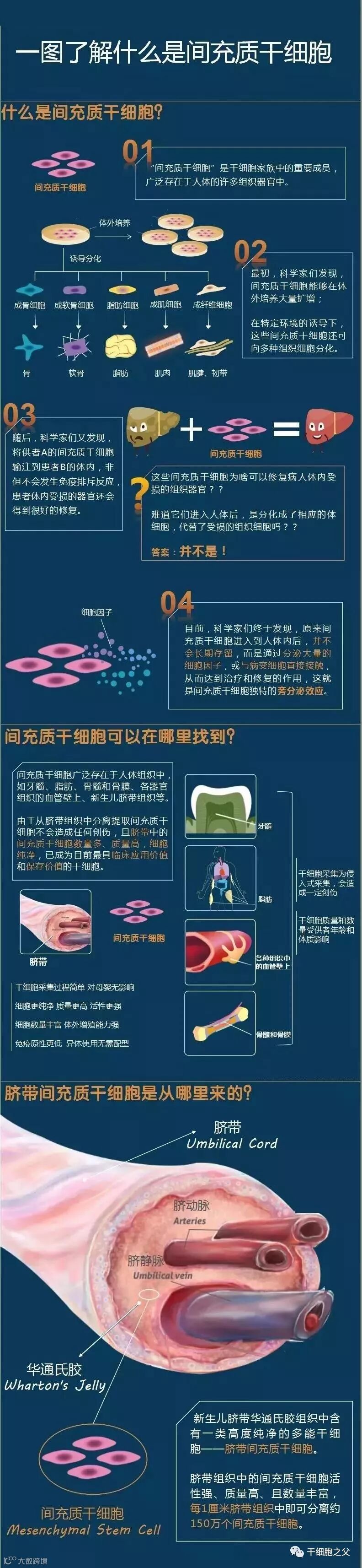 间充质干细胞(MSC)是干细胞家族的重要成员,来源于发育早期的中胚层,通过分泌细胞因子,能减少炎症、减少组织细胞的凋亡、消除纤维化、激活内源性组织器官的干/祖细胞的增殖,从而达到修复组织器官的效果。