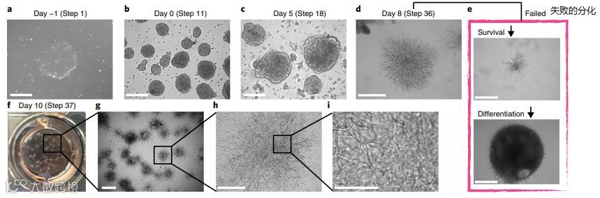 如下图所示[5],是间充质干细胞在体外分化为血管的全过程记录,3D的视角展现了间充质干细胞在VEGF-A(血管内皮生长因子)、FGF-2(成纤维细胞生长因子)、BMP-4(骨形成蛋白)的刺激以及WNT信号通路激活下,由萌芽新生血管逐渐形成血管网络的能力。而图e也显示了间充质干细胞分化失败的结果,以作对比。