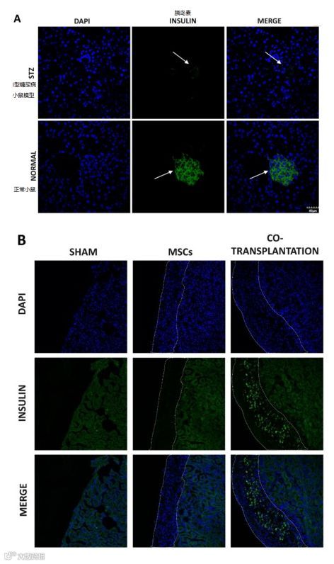 如下图所示[4],图A当用STZ(链脲菌素)成功构建I型糖尿病小鼠模型后,该小鼠与正常小鼠相比,不能分泌胰岛素(绿色染色)。此时,如果给予I型糖尿病小鼠移植MSCs(CO-transplantation),如图B所示可以看到,疾病小鼠恢复了分泌胰岛素的能力。