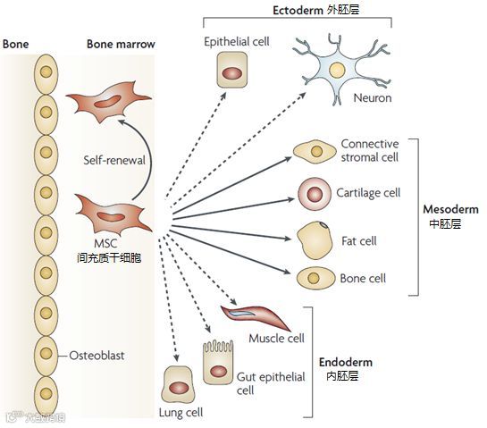 它不仅可以分化为同胚层来源的相关细胞、组织,如脂肪、骨骼、软骨等,近来的研究还发现,间充质干细胞还具有跨胚层分化的特点(如下图所示[1])。