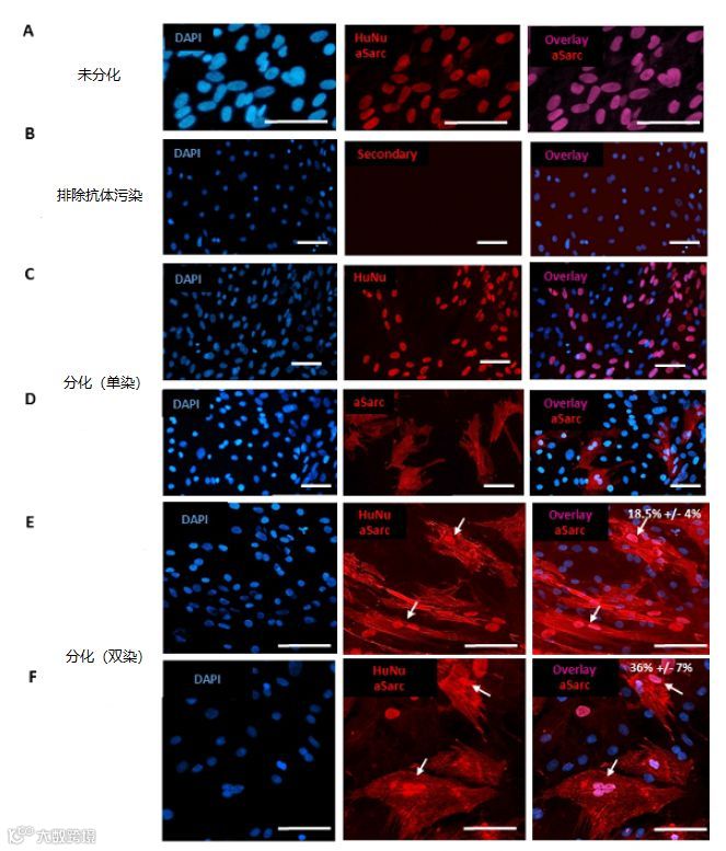 如下图所示[2],在体外成功观察到了间充质干细胞再生修复大鼠心肌细胞的过程,图中蓝色DAPI染色代表细胞核,红色aSarc蛋白染色代表心肌细胞,红色HuNu蛋白染色代表间充质干细胞。图A显示间充质干细胞未分化的状态,图C和图D分别显示了间充质干细胞开始分化,图E和图F展现了随时间推移,间充质干细胞越来越多得分化为心肌细胞的状态。