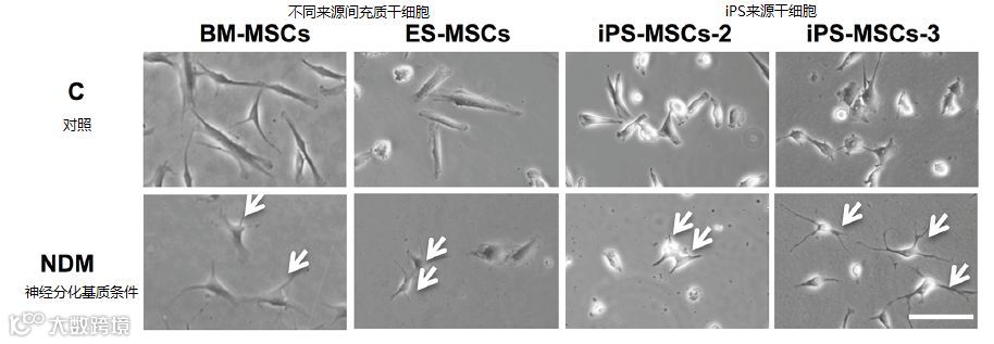 如下图所示[6],当间充质干细胞在特殊的“NDM(神经分化基质培养基)”中培养时,不同来源的MSC可以分化出具有神经突触形态的新细胞,而区别于原来的梭形细胞。