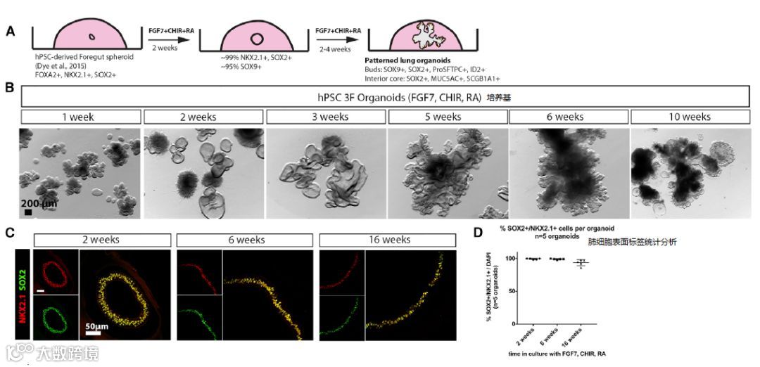 如下图所示[9],图A是由间充质干细胞经过3F培养基(FGF7,GSK-3抑制剂,RA)刺激培养后分化为“类肺器官”的概念过程,图B是刺激后逐渐形成肺芽细胞的过程,图C检测了分化好的肺芽细胞表面的标签蛋白NKX2.1和SOX2,结果发现如图D统计所示,分化好的肺芽细胞确实已经没有了干细胞的标记,而接近97%都是肺细胞的特性。