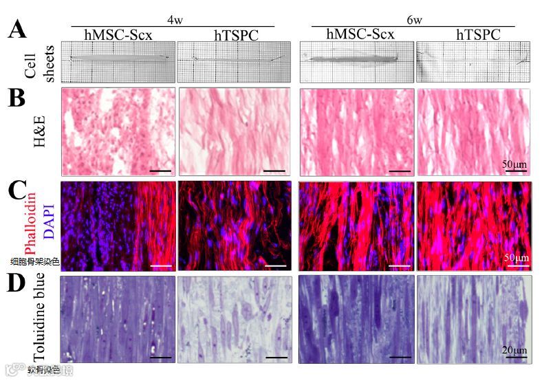 如下图所示[10],间充质干细胞在肌腱转录因子Scx的刺激下(hMSC-Scx),可以在体外分化为与正常肌腱祖细胞hTSPC相比,无论在细胞外形、组织内细胞分布、细胞数量等都十分相似的肌腱组织,甚至在分化6周后,间充质干细胞来源的肌腱细胞,在肌腱延长性方面的优势更大。图A是两种来源肌腱的外观,图B是苏木精&伊红染色下观察的细胞核与细胞质形态,图C是细胞骨架的染色结果,图D是软骨细胞的染色结果。