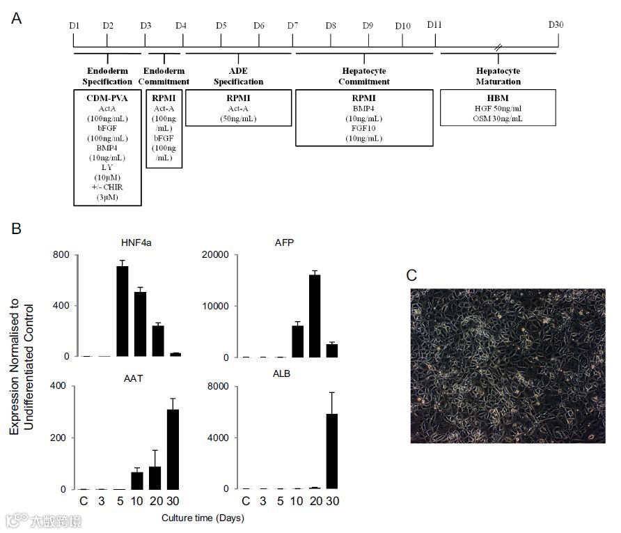 如下图所示[7],图A罗列了体外间充质干细胞分化为肝细胞的步骤和条件,主要是一些因子如Activin-A(人活化素A),BMP4,FGF的参与和WNT信号通路的激活等,图B检测了分化后的细胞表面标记,可以看到一些肝细胞的标签蛋白(HNF4a,AFP,AAT,ALB)含量确实显著提高,证明分化完成的确实是肝细胞,图C是分化完成的肝细胞。