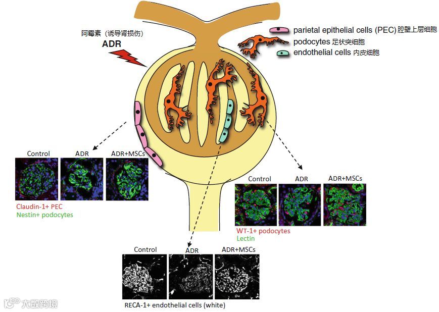 如下图所示[3],和对照(Control)相比,尾静脉输注间充质干细胞(ADR+MSCs)可以再生肾损伤大鼠肾小球中的腔壁上层细胞、足状突细胞和内皮细胞,从而修复肾小球,恢复肾脏功能。