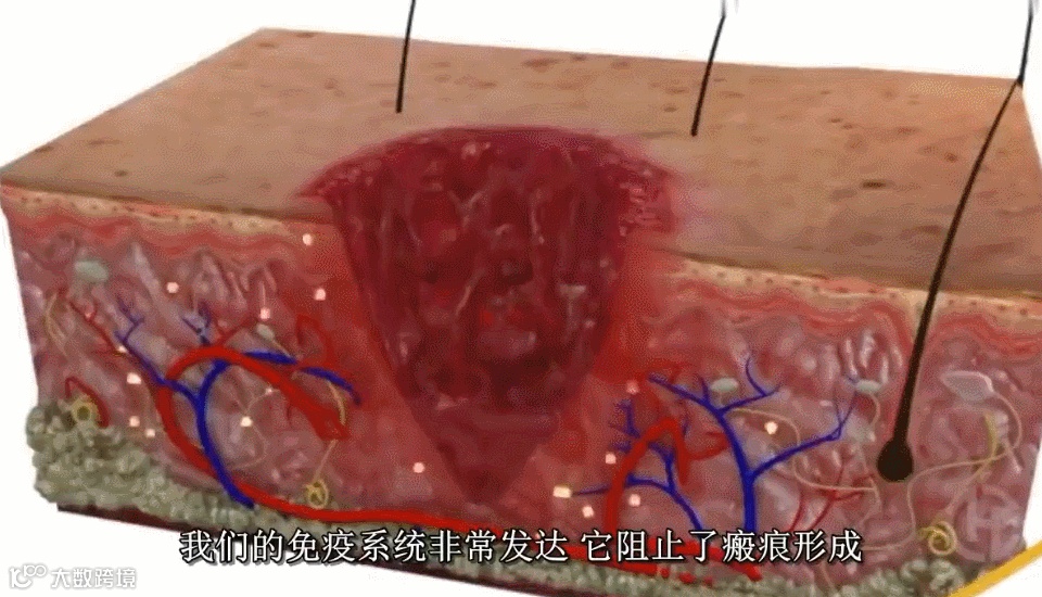 我们的免疫系统非常发达,它阻止了瘢痕形成,从而防止了可能从再生组织中,发展出传染病和癌症。