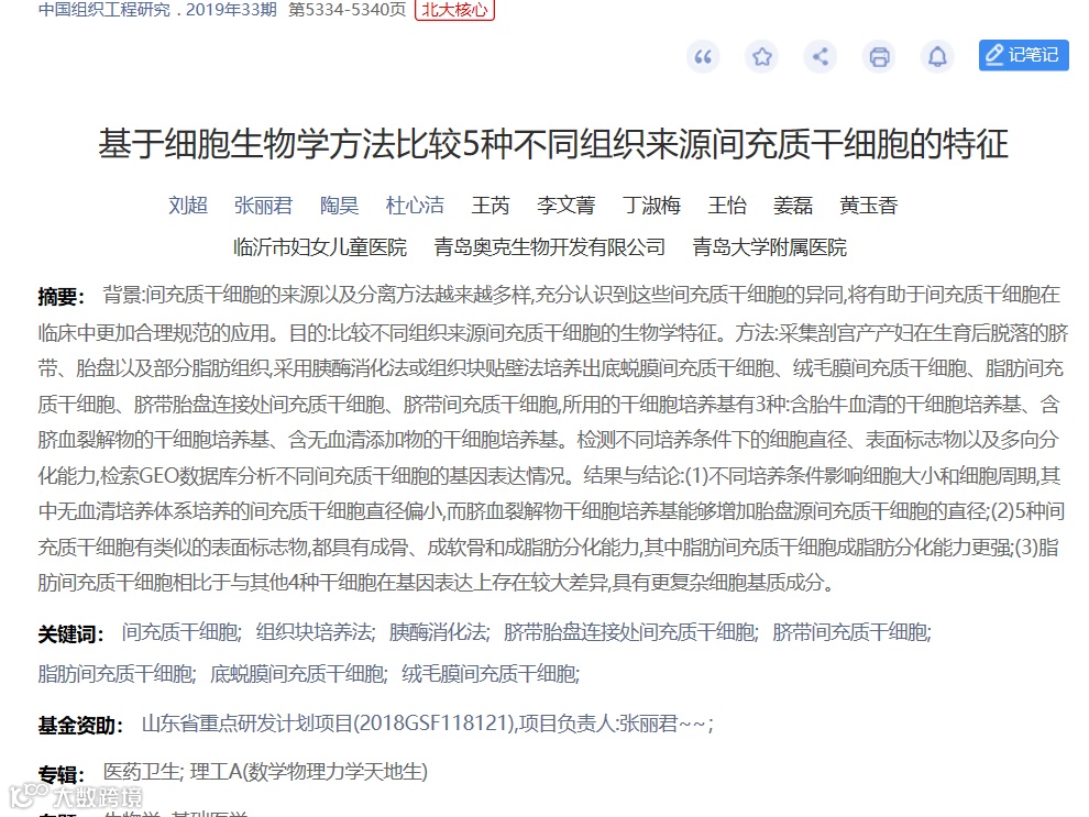 目前临床研究中,MSC应用较为常见的来源骨髓、脂肪、脐带、胎盘等,本文以脐带、脂肪、胎盘这三类比较常见的来源进行总结,针对不同来源间充质干细胞,体外传代培养后不同代次的一些生物学特性的变化(例如:细胞形态、细胞周期检测、表面标记物检测、染色体核型分析、相关基因表达及细胞因子的定量分析)。