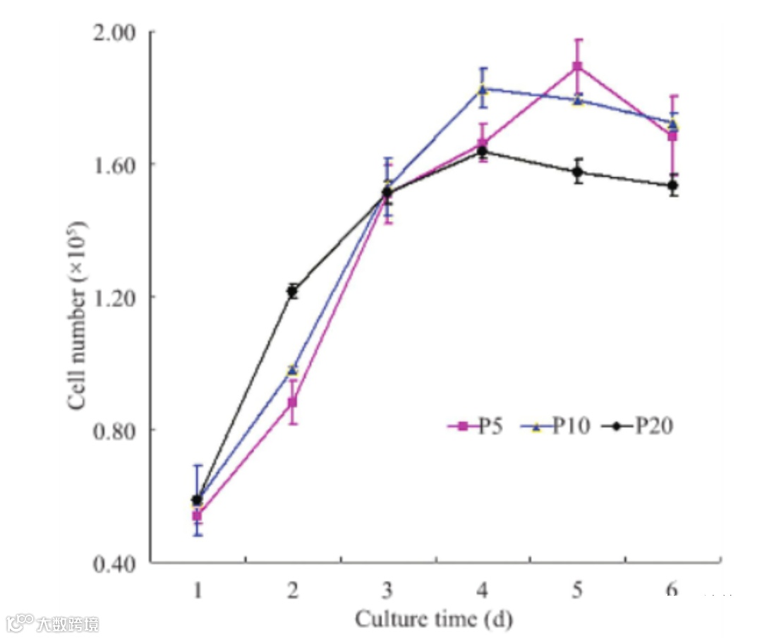 人脐带间充质干细胞长期体外传代培养后其基本的干细胞生物学属性, 如细胞表面免疫标志物和诱导多向分化潜能, 无显著性改变。长期培养至20代, 未发现致病性或致瘤性基因变异。高代次(P20)hUC-MSCs的细胞增殖活性和端粒酶活性与早期低代次(P5)细胞无显著性差异。随着培养代次的增加, 细胞开始出现老化, 尤以20代细胞表现最为明显。