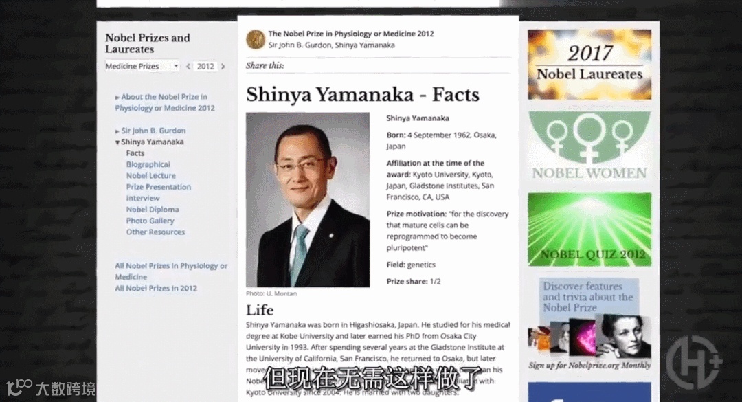 诺贝尔奖得主、日本科学家山中伸弥开发出一种方法,能将皮肤细胞转变为类似胚胎干细胞的多能干细胞。