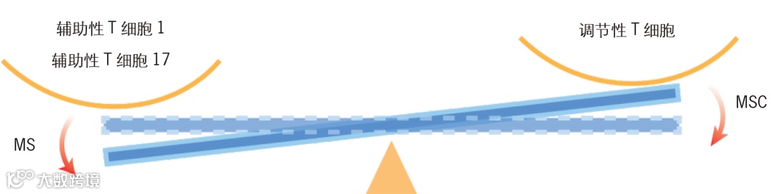 正常人体内,介导免疫耐受的调节性T细胞与参与自身免疫的辅助性T细胞17处于动态平衡状态;而MS患者体内这一平衡被打破,辅助性T细胞17与调节性T细胞的比值显著高于正常人群,导致自身免疫对机体的破坏。MSC可以促进调节性T细胞的增殖,恢复辅助性T细胞17与调节性T细胞的正常比值。