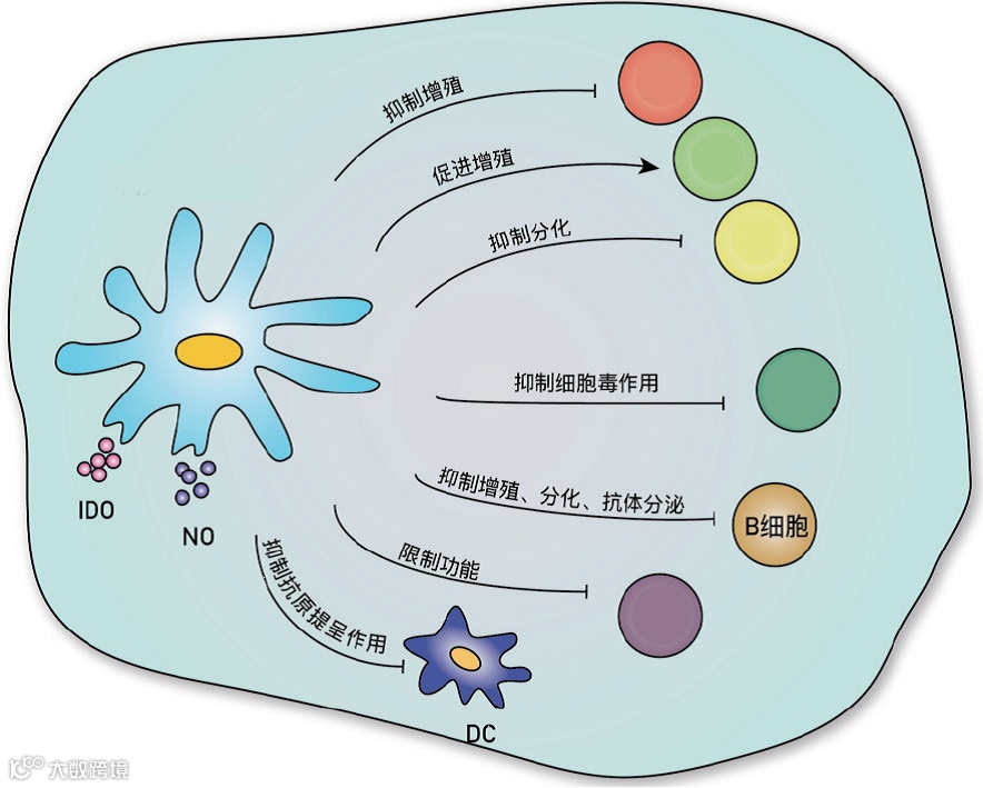 MSC可以分泌多种抑制炎症的细胞因子,发挥免疫抑制作用。主要是吲哚胺2,3-二氧化酶(indoleamine-2,3-dioxygenase,IDO)和一氧化氮(nitric oxide,NO),发挥了尤为重要的作用。