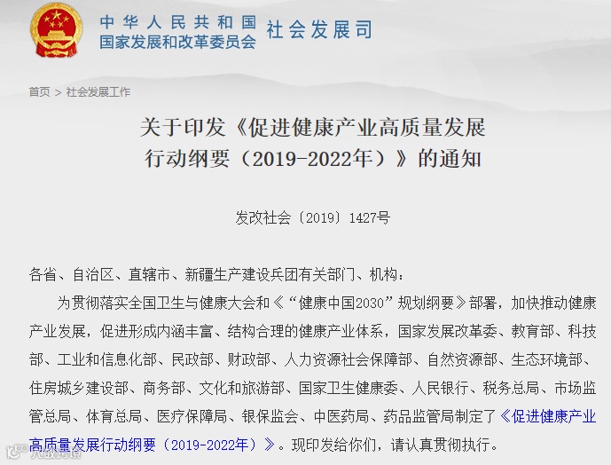 2019年8月,国家发改委官网发布了《促进健康产业高质量发展行动纲要(2019-2022年)》。文件中明确:到2022年,基本形成内涵丰富、结构合理的健康产业体系,优质医疗健康资源覆盖范围进一步扩大,健康产业融合度和协同性进一步增强,健康产业科技竞争力进一步提升,人才数量和质量达到更高水平,形成若干有较强影响力的健康产业集群,为健康产业成为重要的国民经济支柱性产业奠定坚实基础。
