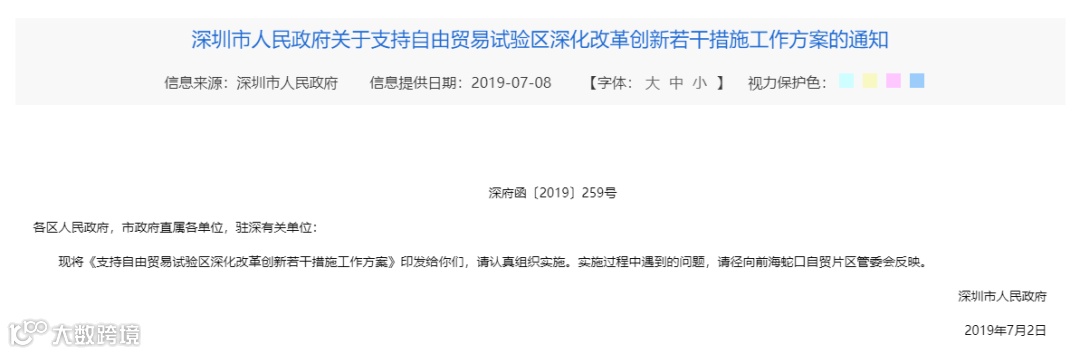 【深圳市人民政府关于支持自由贸易试验区深化改革创新若干措施工作方案的通知】