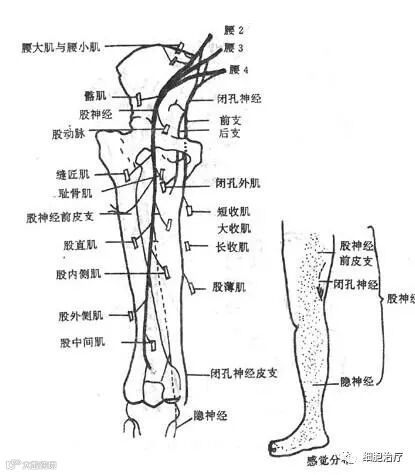股神经来自上腰椎,支配到膝关节的内侧和下肢的前面,股神经所经之处的组织发生病变均可引起膝关节疼痛。从临床经验来看,由于上部腰椎病变累及股神经而引起的膝关节疼痛等症状屡见不鲜,大部分膝关节疼痛患者均可在腰骶部、臀部外侧(阔筋膜张肌、臀大肌、臀小肌)髋部的和腹股沟(内收肌群)处查到明显的压痛点,对这些压痛点进行强刺激推拿或银质针疗法治疗,均可收到立竿见影的效果。部分腰椎间盘突出患者也存在膝关节疼痛、酸胀等症状,当腰椎间盘突出治愈后,膝关节疼痛症状也会不治而愈。