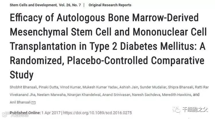 在发表于《干细胞研究及进展》(Stem Cell and Development)上的临床研究中,有30名2型糖尿病患者随机接受了自体骨髓间充质干细胞或自体骨髓单个核细胞注射。这30名患者的病程均在5年以上,并且都接受了三组口服降糖药联合胰岛素治疗。