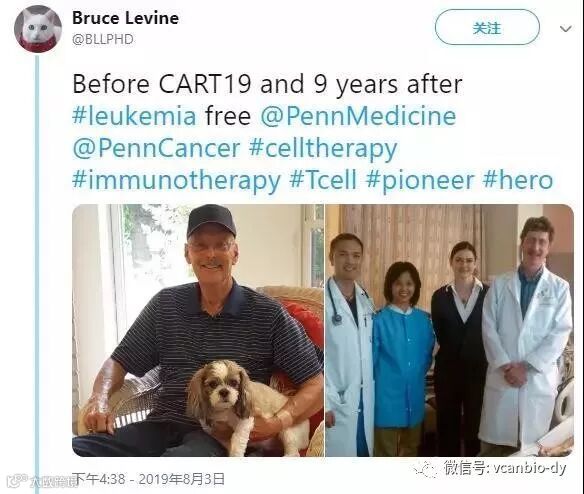 2019年8月3日,Bruce L. Levine 在twitter上更新了一条消息,他说道:“截止至今,第一个接受CAR-T疗法的成人患者Bill Ludwigs(患有慢性淋巴性白血病-CLL)实现了9年的无癌生存”。在此,不得不提到第一位接受CAR-T疗法的儿童患者Emily(患有急性淋巴细胞白血病-ALL),她自接受CAR-T治疗后已实现7年的无癌生存。
