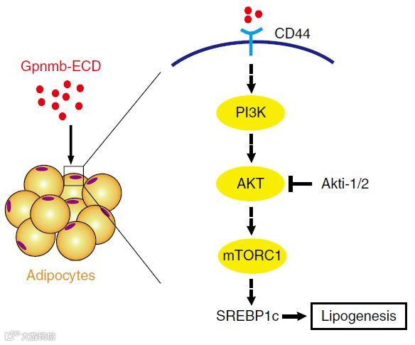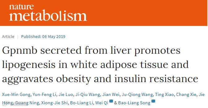 在这里,研究人员鉴定糖蛋白非转移性黑色素瘤蛋白B(Gpnmb)作为由L-Scap - / - 和L-gp78 - / - 小鼠的肝脏分泌的蛋白质。 升高的Gpnmb循环水平增加WAT中的脂肪酸合成并加剧饮食诱导的肥胖(DIO)和胰岛素抵抗。 用中和抗体阻断Gpnmb可改善DIO和胰岛素敏感性。重要的是,血清Gpnmb水平与体重指数(BMI)密切相关,并且是人类肥胖和糖尿病的危险因素。因此,该研究发现,Gpnmb介导肝脏与WAT的通讯作用,并在平衡全身脂质体内平衡中发挥重要作用。总而言之,加上血清Gpnmb水平与人类肥胖和糖尿病的强烈关联,这些发现进一步表明血清Gpnmb在临床诊断和干预代谢紊乱方面的潜在应用。