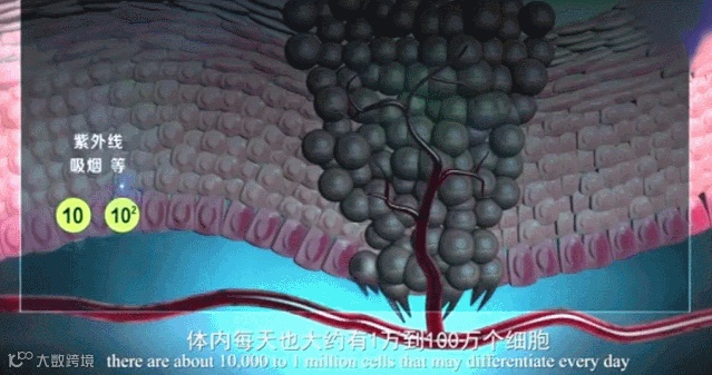 研究表明,人体内的细胞本身也有生命周期,正常人体内每天约有100亿个细胞在生长和更新,在代谢过程中,细胞内的基因会因为环境因素而导致异常,即便是健康人,体内每天也大约有1万到100万个细胞可能发生变异,当异常的突变积累到一定程度,细胞就转变为癌细胞。