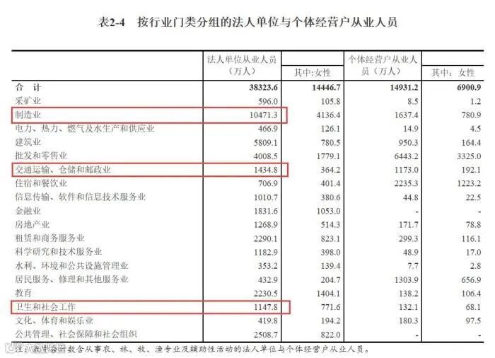 换个方式计算,据《第四次全国经济普查》显示,截至2018年底,中国卫生和社会从业者为1147.8万人,交通运输、仓储和邮政业1434.8万人,制造业10471.3万人。