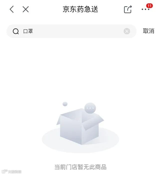 京东搜索“口罩”周边药店显示“无此类商品”。
