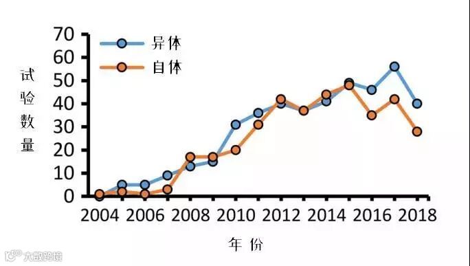 图3:每年新增临床试验,按自体/异体来源分类