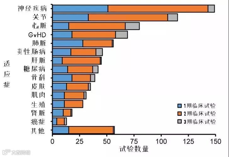 Maciej Kabat等人将临床试验适应症分为14类,无法分类或数量太少归为其他。其中,在注册的适应症中,神经系统疾病(17%)和关节疾病(15%)最多,其次是心脏疾病(8.8%)和GvHD(8.3%),后两者的3期临床试验占比更高。