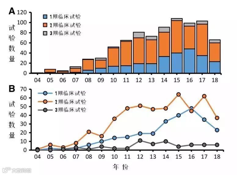 图2是全球MSCs临床试验的情况,A图反映总量,B图反映各个阶段临床试验的趋势。