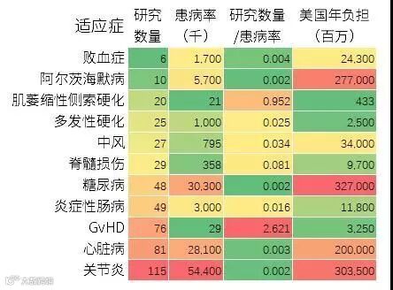 从研究数量与患病率的对应相关性来看,GvHD研究最多,肌萎缩侧索硬化症次之。对应相关性偏少的适应症有:败血症、阿尔茨海默症、糖尿病、心脏病和关节炎。
