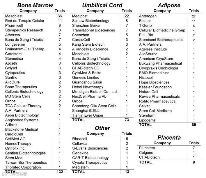 在注册的MSCs临床试验,总共82家公司参与。有3家开展的临床试验就占比30%,他们分别使用不同组织来源的MSCs产品:Mesoblast(骨髓)、Anterogen(脂肪)和Medipost(脐带)。