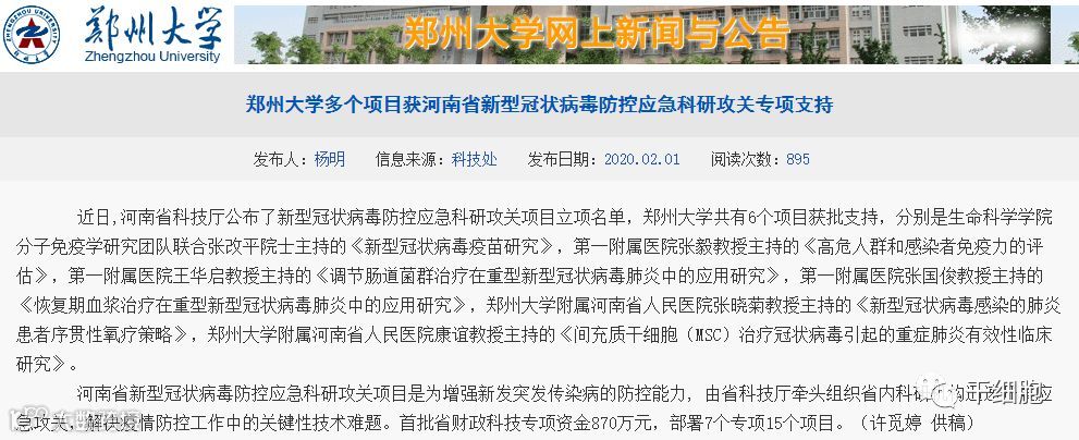 近日,河南省科技厅公布了新型冠状病毒防控应急科研攻关项目立项名单,郑州大学共有6个项目获批支持,分别是