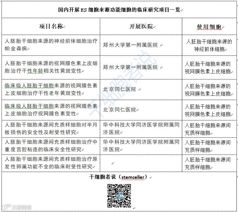 表1.已备案的ESC来源的功能细胞的临床研究项目(干细胞者说数据库.)