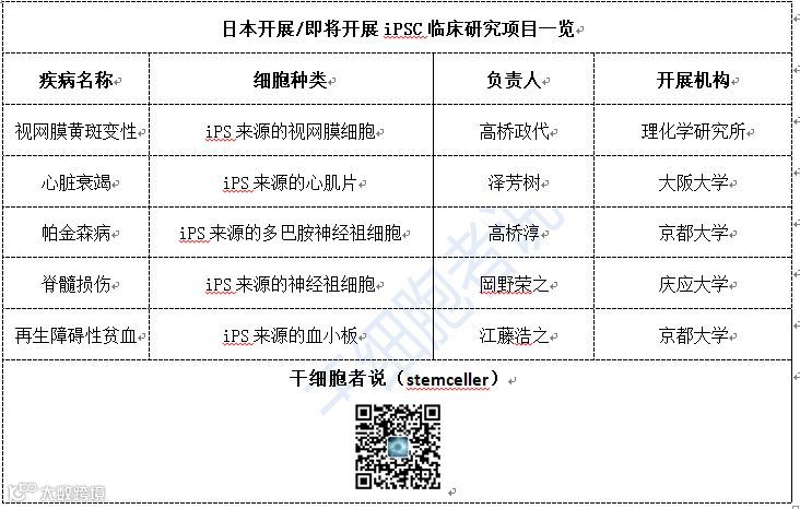 表2.日本开展的iPSC临床研究项目(干细胞者说数据库.)
