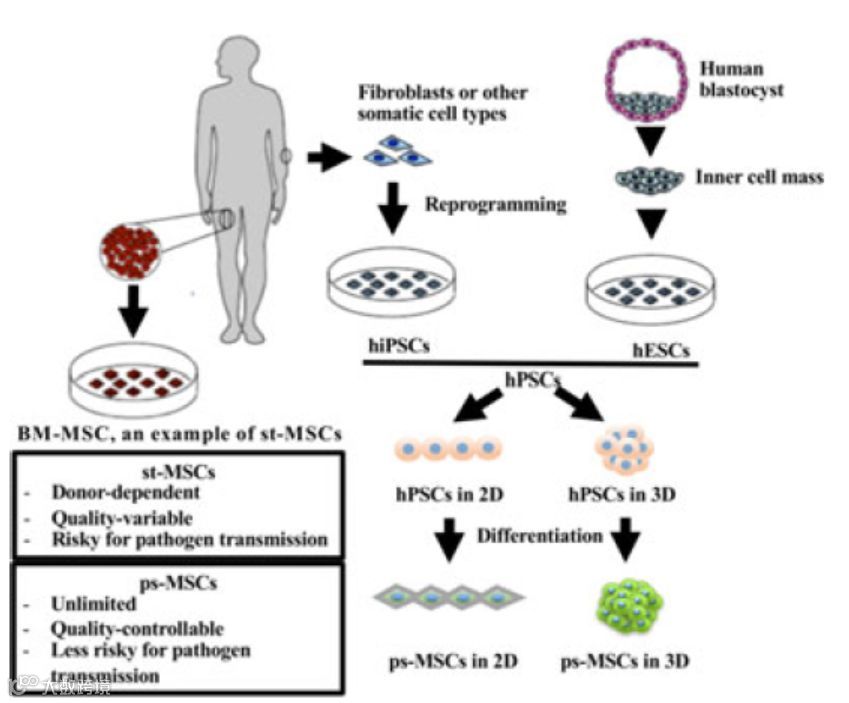 这里说的多能干细胞包括胚胎干细胞(ESCs)和诱导多能干细胞(iPSCs),具有分化成各种体细胞的潜能,自然也包括MSCs。多能干细胞衍生的MSCs包括两种:一种是ES-MSCs,另一种是iPS-MSCs。